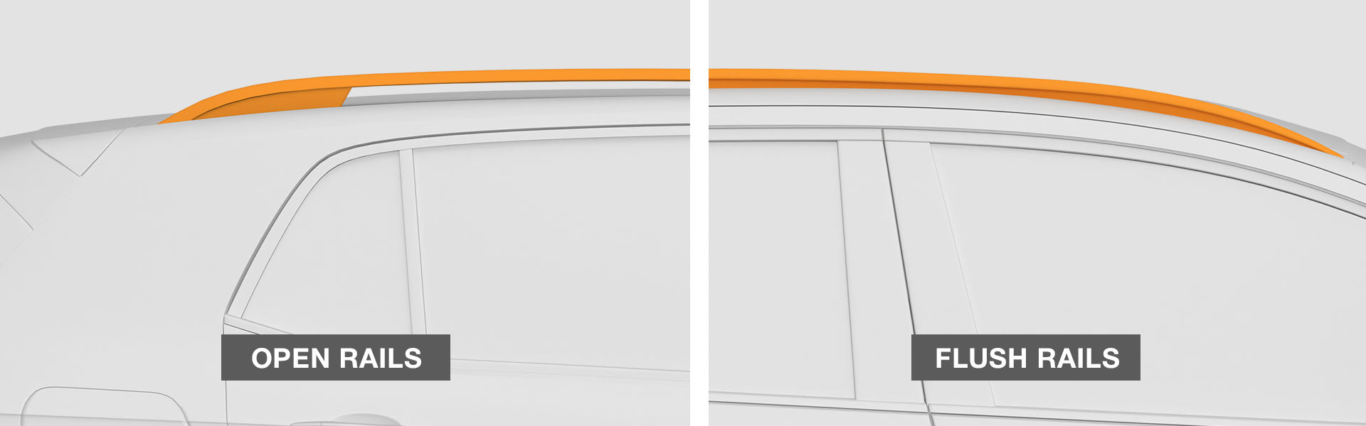 Open and flush rails refers to the type of rails on your car which the roof bars are mounted onto. Open rails have a gap between the rail and the roof, while flush rails sit directly on the roof with no gap.